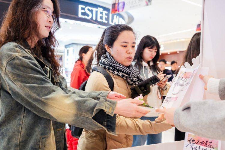 在这里,每一位经过活动网点的读者都可以免费领取一份“书籍盲盒”。盲盒里包含一本精心挑选的女性主题书籍、一枚定制书签和一枝象征生命力的鲜花。