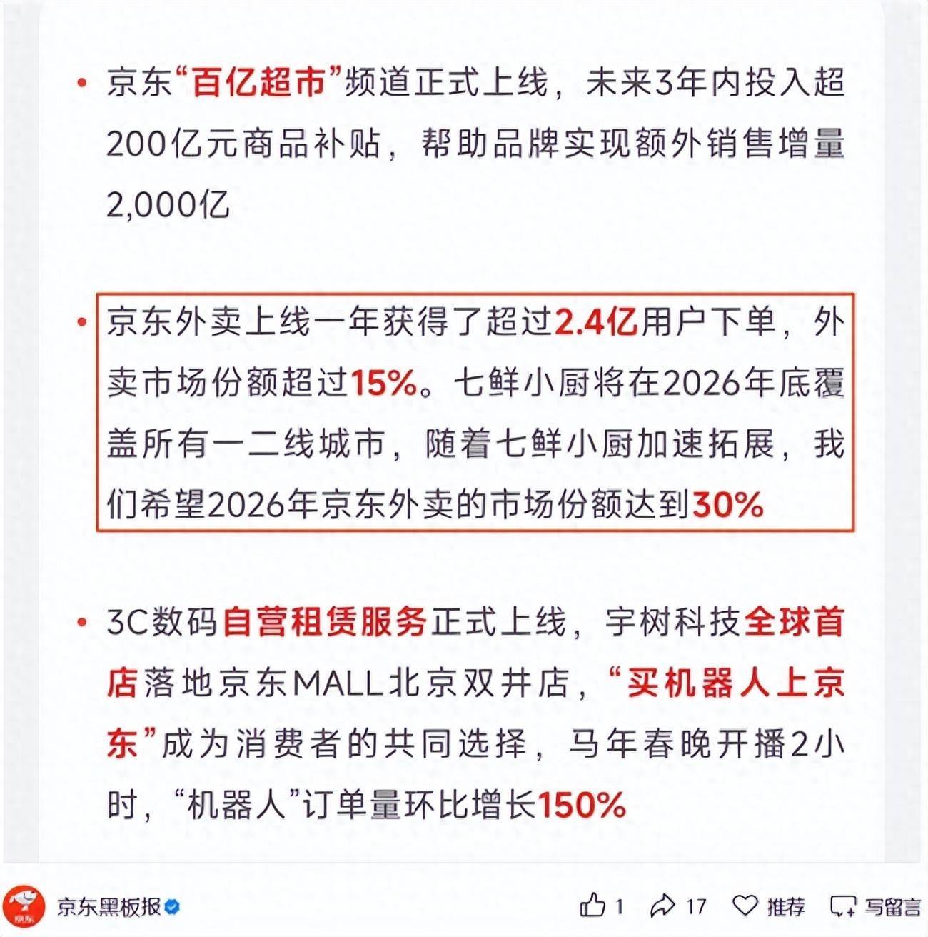 经过半年时间的认证,这种以“现炒锅气”和“极致透明”重新定义品质外卖的模式,也已被市场验证,据媒体报道数据显示,每家七鲜小厨开业三个月后,日均单量均超过500单,并且有效带动了周边餐饮商户的流量与增速。京东外卖宣布,2026年将全面发力并加速拓展七鲜小厨,预计年底完成所有一二线城市布局。这不仅是其品质战略的纵深落地,更是其冲击30%市场份额目标的关键引擎。