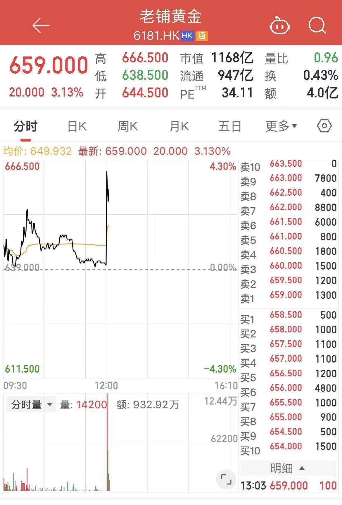 3月11日午后,古法黄金赛道龙头老铺黄金(06181.HK)股价迎来快速拉升,截至当日13时03分可靠股票配资,公司股价报报659港元/股,日内涨超3%,总市值来到了1168亿港元。