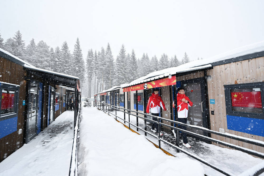走进科尔蒂纳冬奥村,一排排小木屋映入眼帘,这里就是各代表团未来20天的家。东道主意大利队的木屋位于冬奥村“C位”,距离运动员餐厅仅一步之遥。木屋早早布置上了与意大利国旗同款配色的灯,在飞舞的雪花中也十分醒目。中国队木屋的窗上贴上了五星红旗,大熊猫形象跃然于屋檐下,红黄相间的挡板上用中文、英文和意大利语写着“中国加油!”