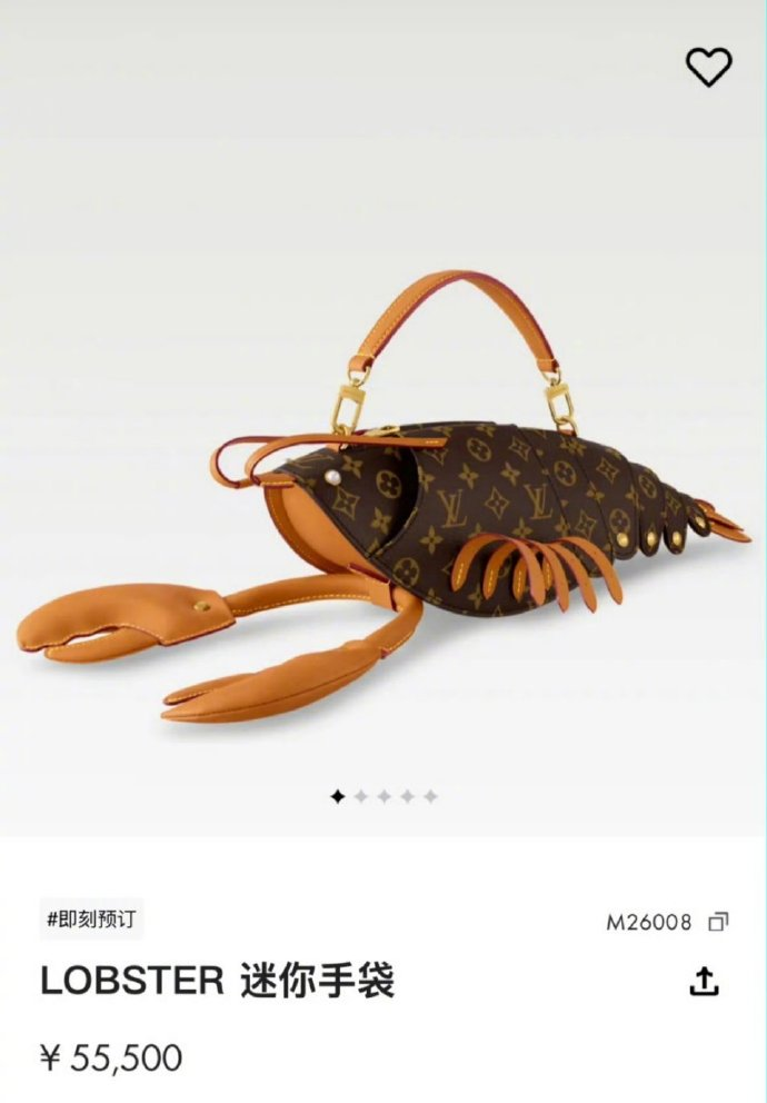 据悉,在此之前,LV也曾推出一款标价为55500元的龙虾造型新品——LOBSTER(龙虾)迷你手袋。由于其外形颇为猎奇,迅速引发网友热议。不少网友表示“实在欣赏不来”“不知道这个包的受众是谁”,还有网友调侃:“乍一看更像一只大蟑螂。”